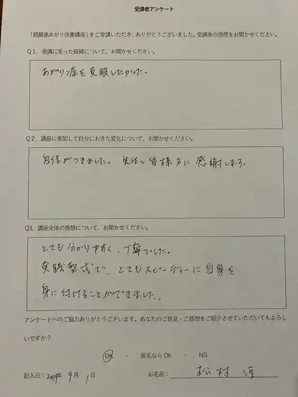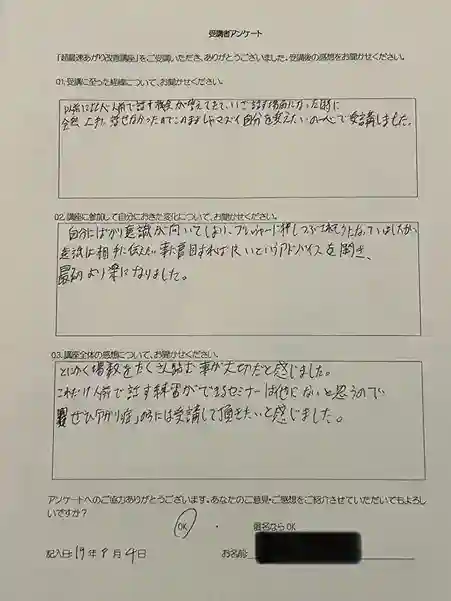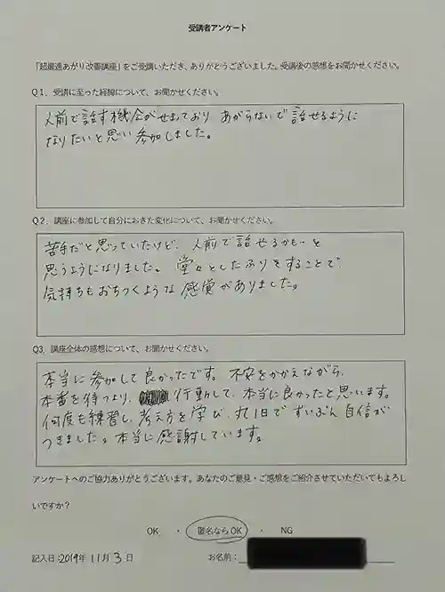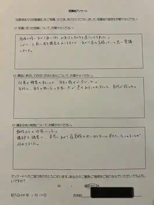 講師も誠実で、本当にあがり症克服の力になりたいと教えていらっしゃることが伝わりました。