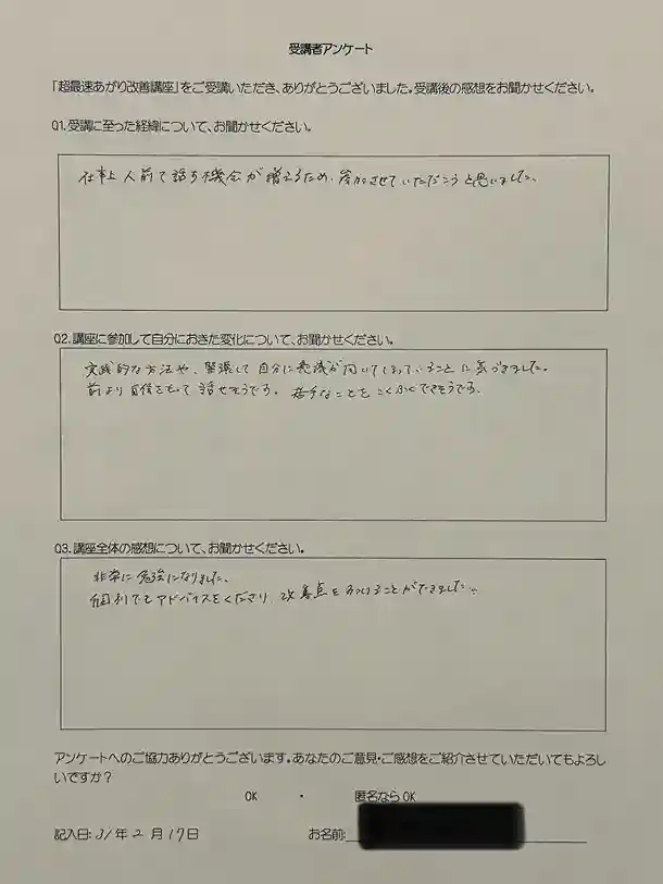 職場の部署移動があり、人前で1人で話す事が多くなり、緊張で全く話せない状況がありました。このままでは仕事がうまくいかないと思い、何とかしたいという気持ちで受講に至りました。