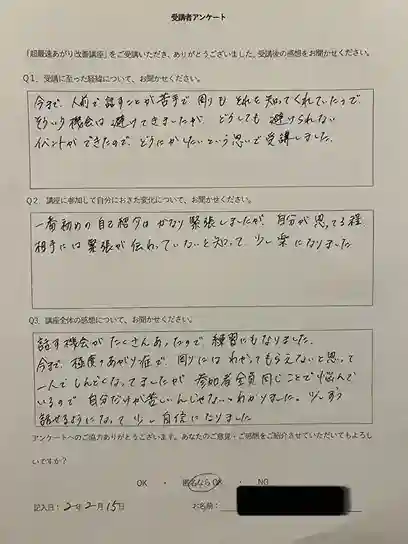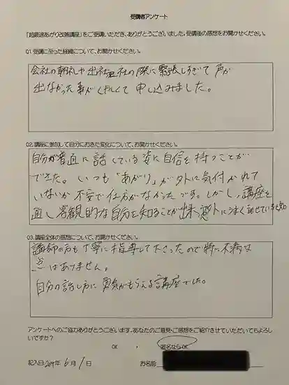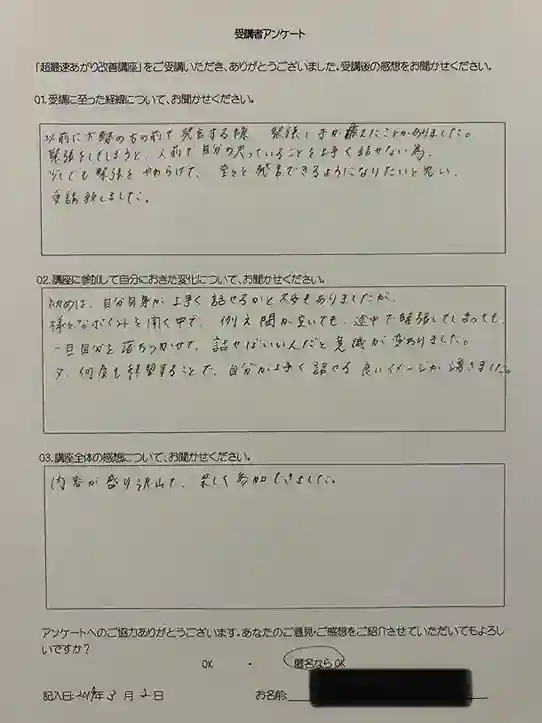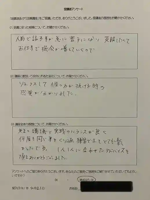 以前に大勢の方の前で発言する際、緊張して震えたことがありました。緊張をしてしまうと、人前で自分の思っていることをうまく話せない為、少しでも緊張をやわらげて、堂々と発言できるようになりたいと思い、受講致しました。
