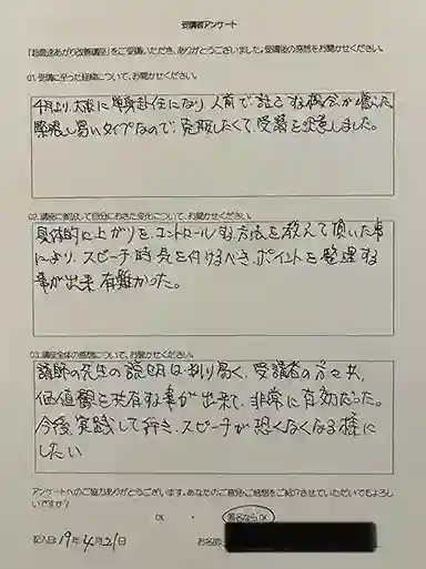 初めは、自分自身が上手く話せるかと不安もありましたが、様々なポイントを聞く中で、例え間が空いても、途中で緊張してしまっても、一旦自分を落ちつかせて、話せばいいんだと意識が変わりました。又、何度も練習することで、自分が上手く話せる良いイメージが湧きました。