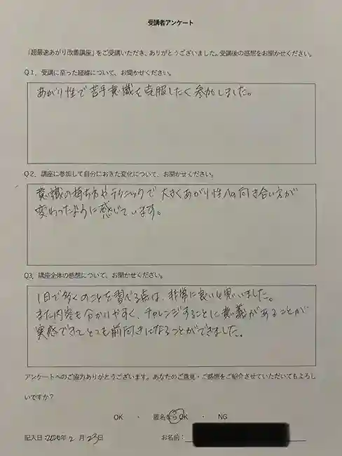 中3の人前で先生に怒られたことをきっかけに、スピーチで声が震えるようになったが、今日の講座を通して様々なスキルを学べたため、今後の訓練に活かしていこうと思う。