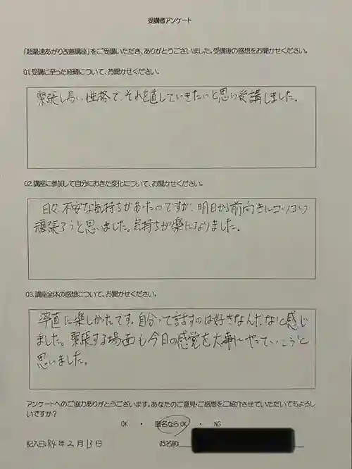 緊張し易い性格で、それを直していきたいを思い、受講しました。